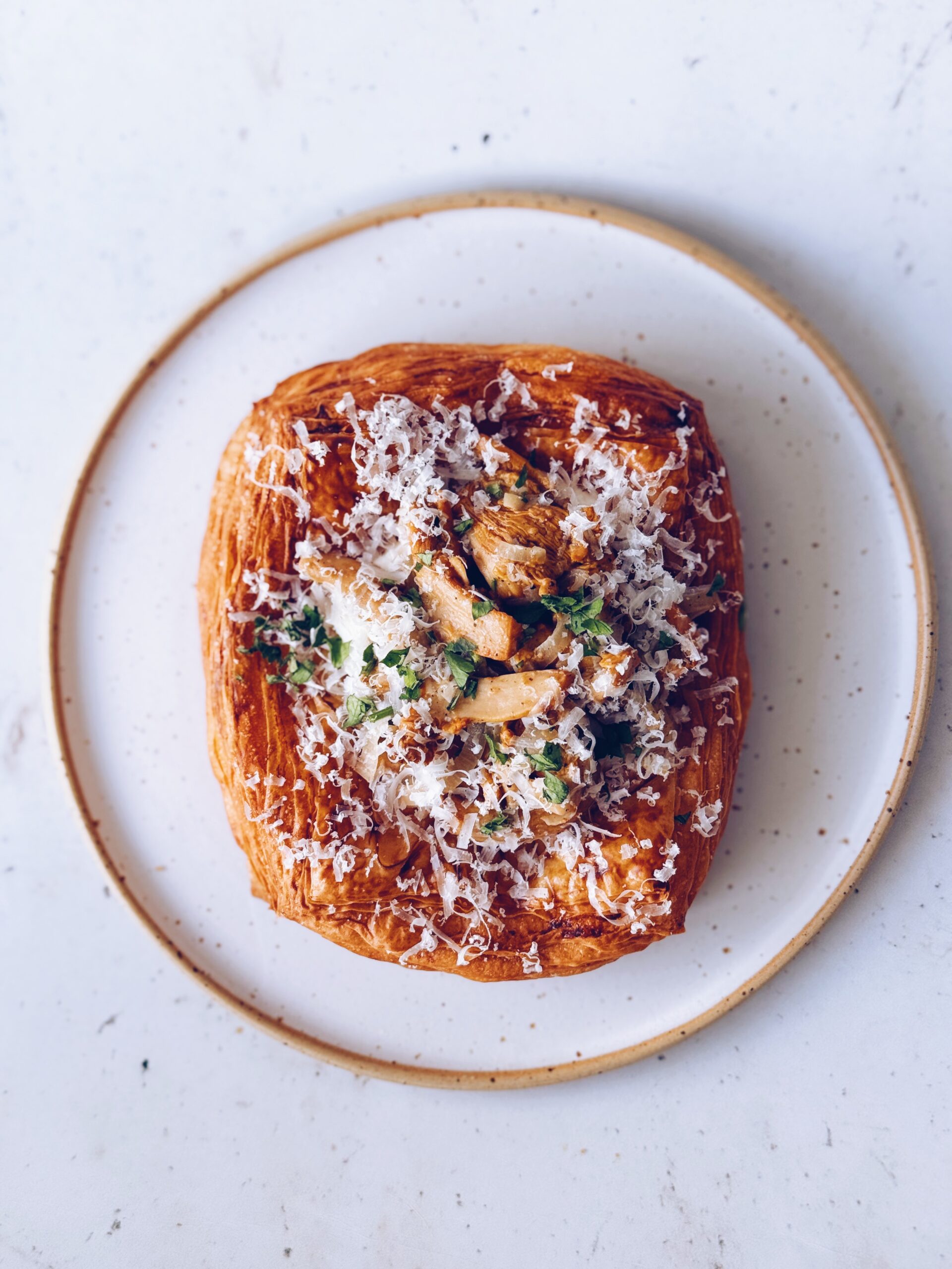 Danisz | labneh – kurki – pecorino– ręcznie robione (czas produkcji to 3 dni!) ciasto półfrancuskie w wersji wytrawnej z labneh’em Naszej produkcji, podsmażonymi na masełku z cebulką kurkami oraz twardym, długodojrzewającym serem w postaci wiórek <3