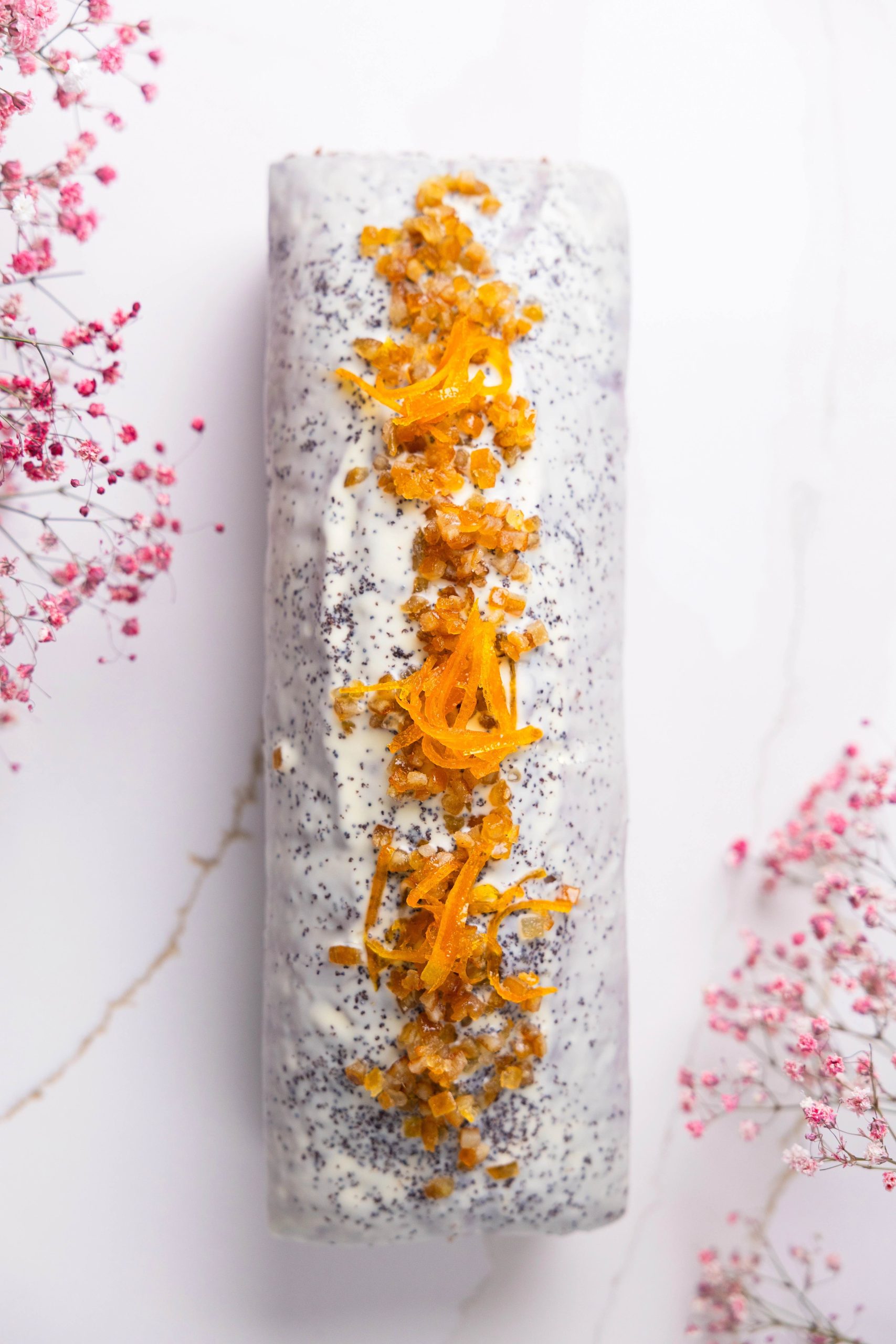 Skład: jajka, cukier biały, mascarpone (śmietanka pasteryzowana, regulator kwasowości: kwas cytrynowy), mąka pszenna typ 500, proszek do pieczenia, olej z pestek winogron, zest z pomarańczy, zest z cytryn, mak niebieski, kandyzowana skórka pomarańczowa (skórka z pomarańczy, cukier, woda), sok z cytryn, biała czekolada Callebaut (cukier, masło kakaowe, mleko pełne w proszku, lecytyna sojowa, naturalny aromat waniliowy), śmietanka 36% (śmietanka z mleka, białka mleka, karagen).